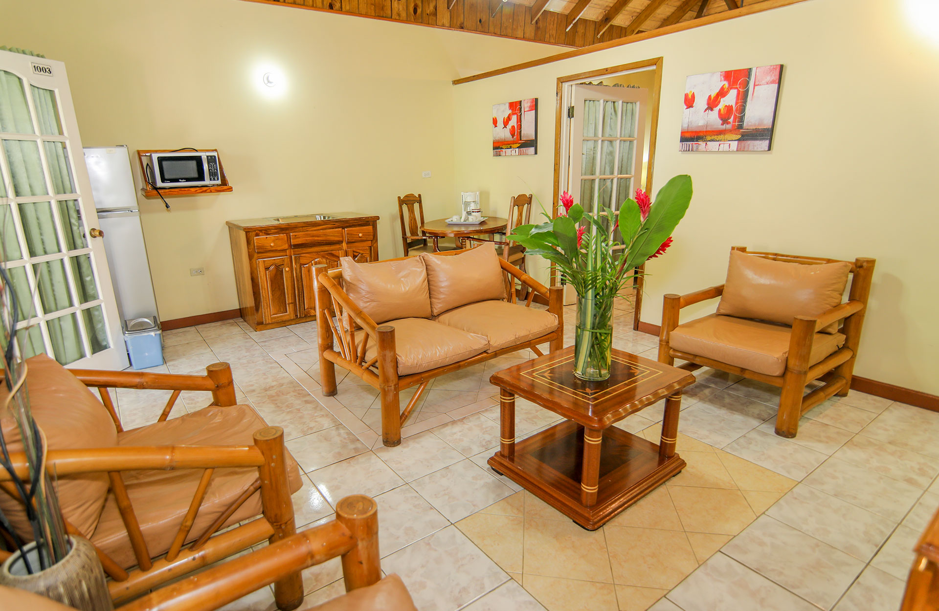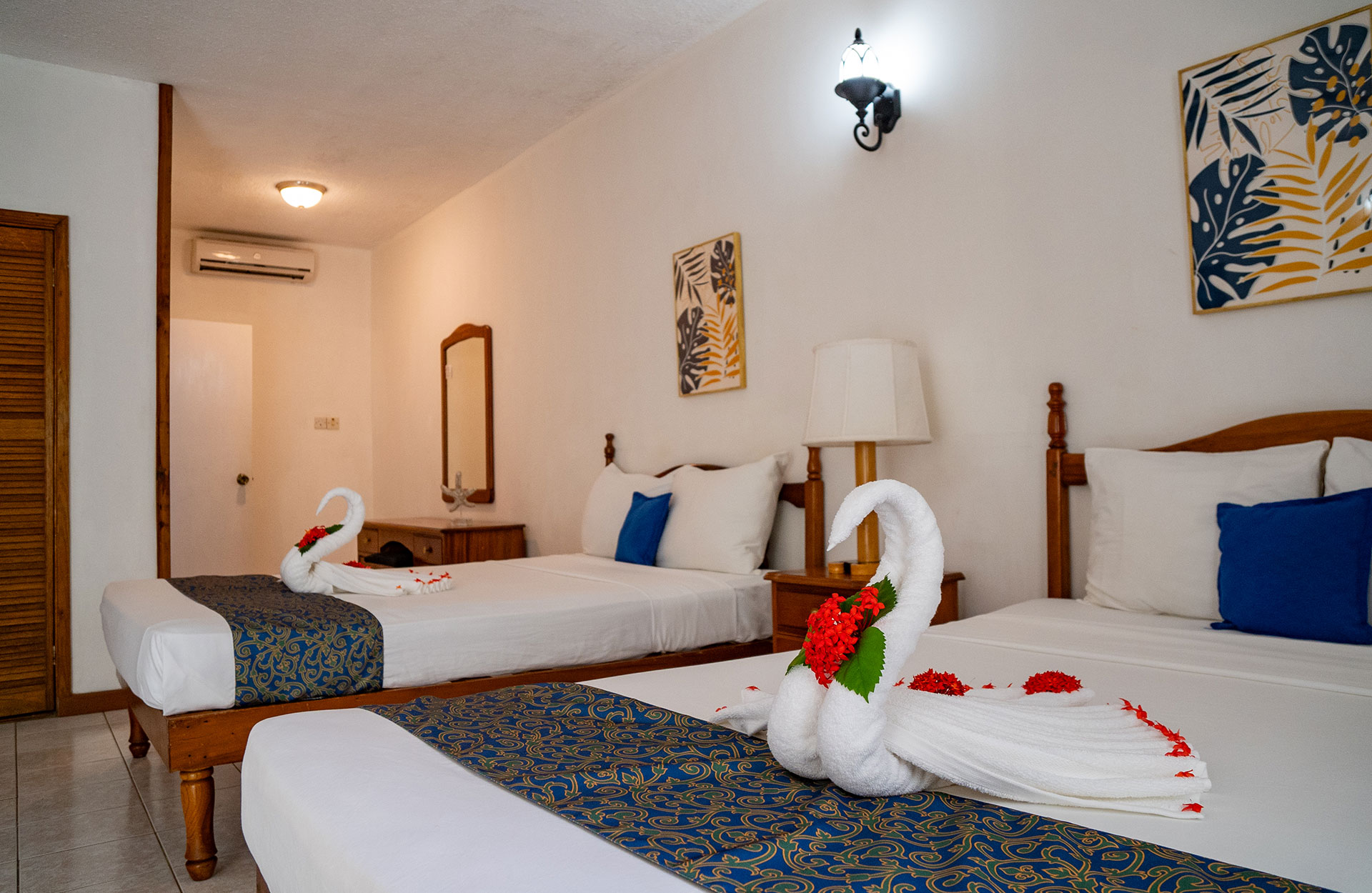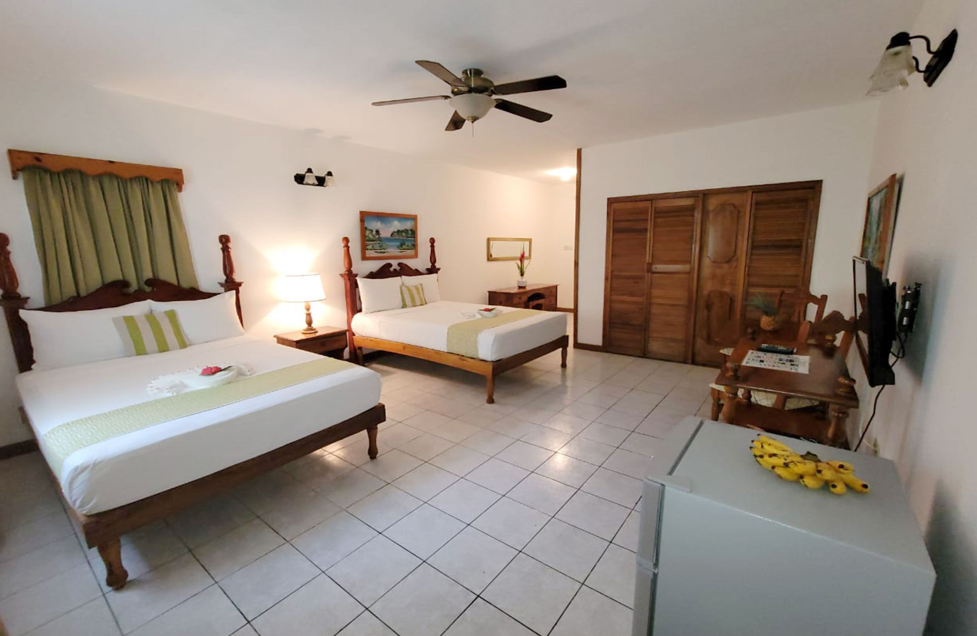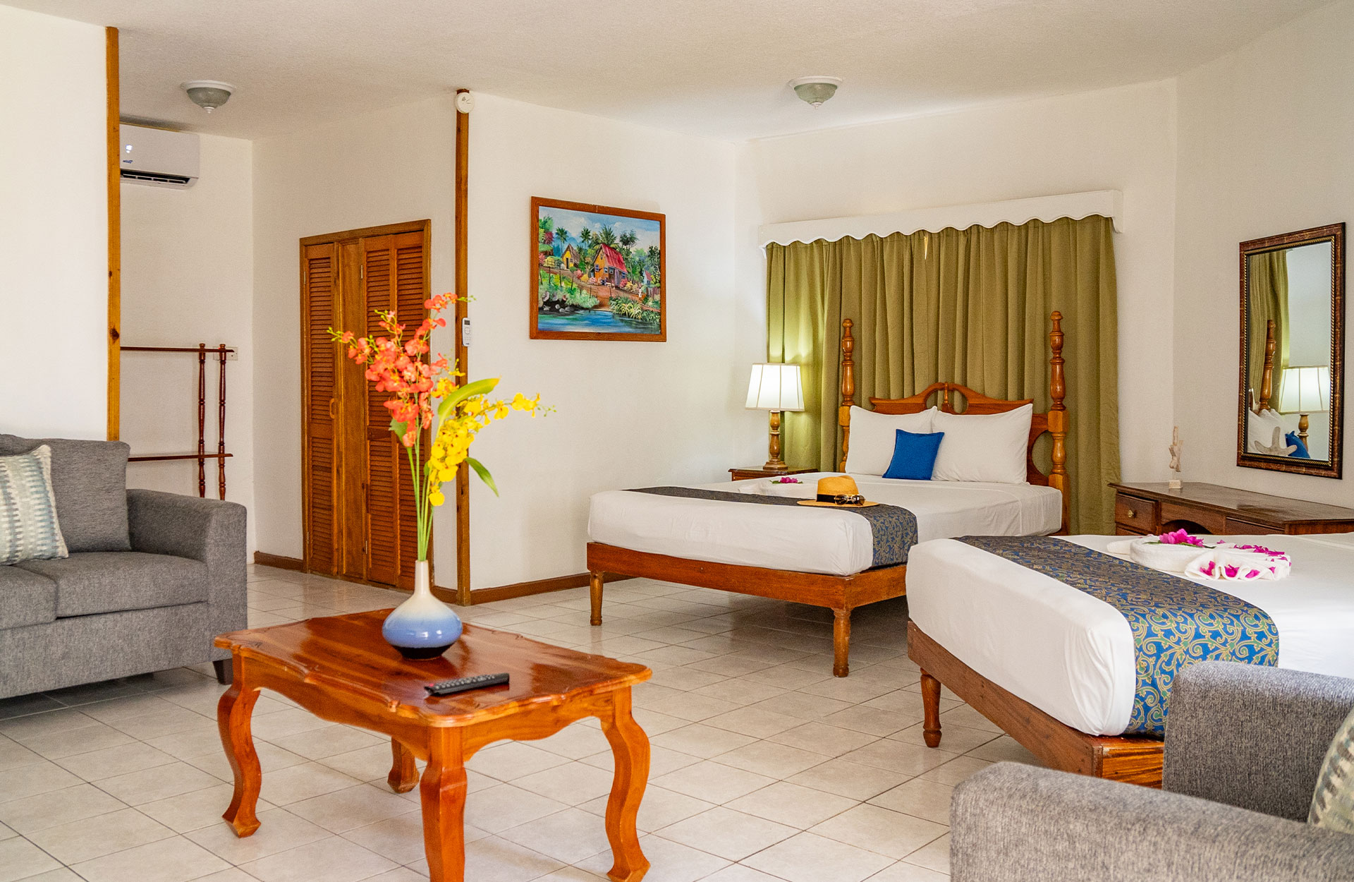 Stay in Comfort: Junior Suite with Garden View at Merrils Resort. Experience the ultimate blend of comfort and charm in the Junior Suite with Garden View at Merrils Resort in Negril. Perfectly designed for relaxation, this 75 sq. ft. suite offers the choice of two double beds or a king-size bed, accommodating up to three adults or two children with an adult.